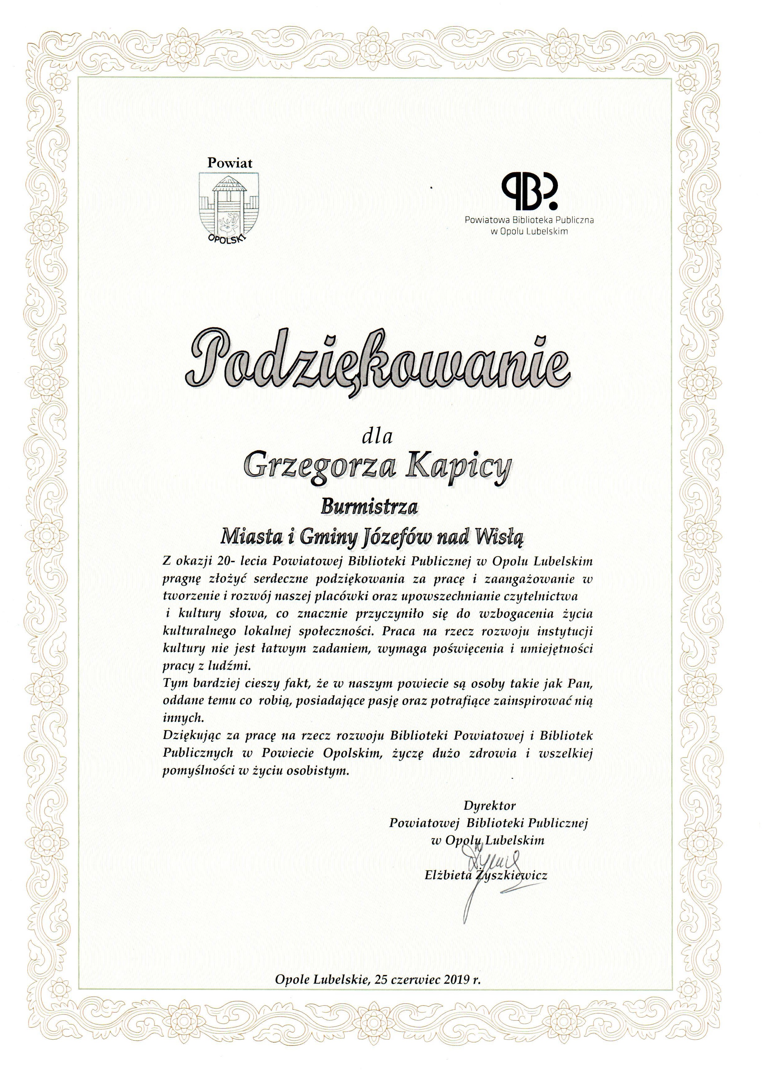 Jesteś tutaj: Strona główna / Podziękowanie z okazji 20-lecia Powiatowej Biblioteki Publicznej