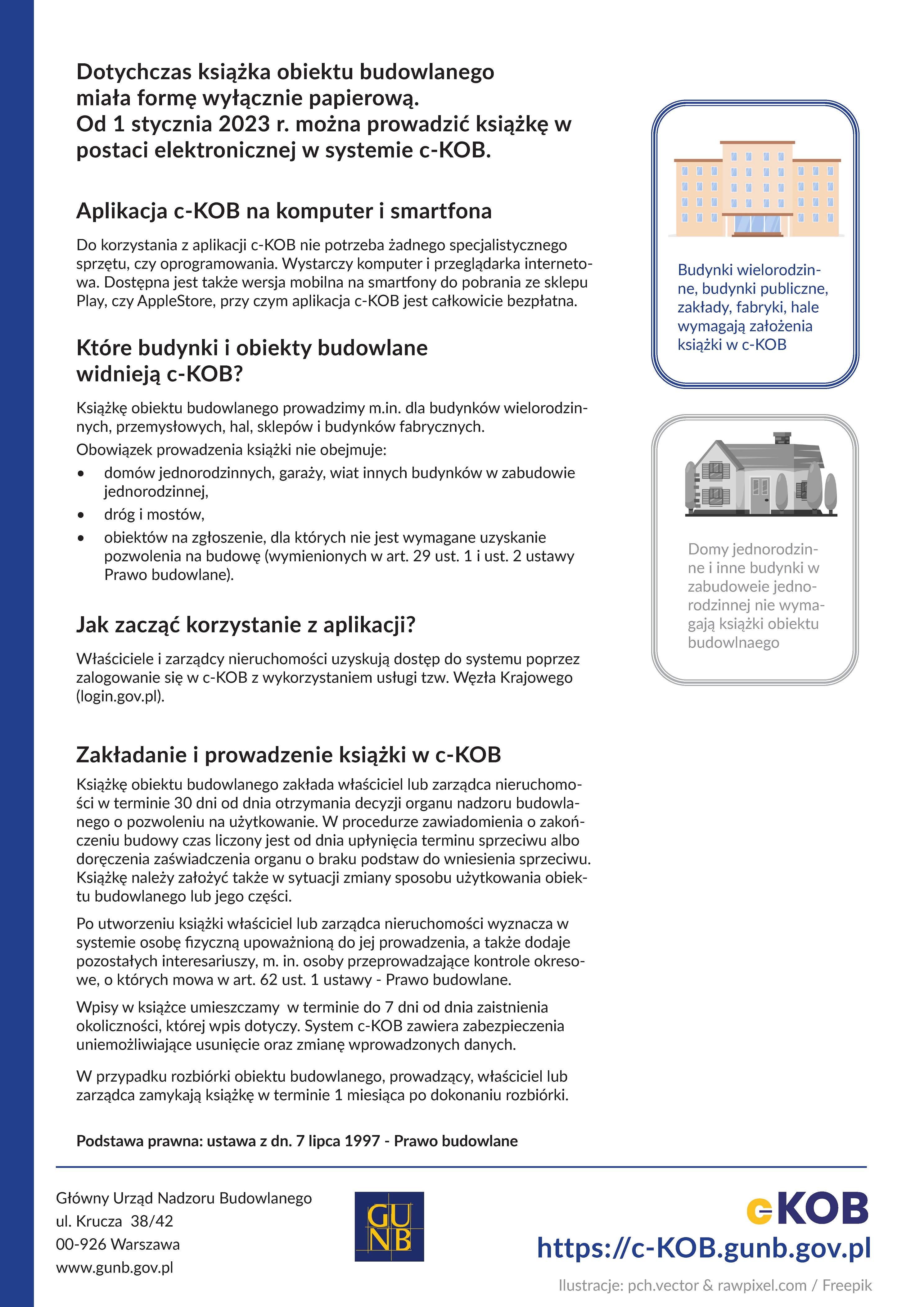 Od 1 stycznia 2023 r. pod adresem https://c-kob.gunb.gov.pl dostępna będzie Cyfrowa Książka Obiektu Budowlanego (c-KOB) – oficjalna, rządowa aplikacja do prowadzenia książki obiektu budowlanego. c-KOB umożliwia w prosty sposób założenie i prowadzenie książki, wprowadzanie informacji o ekspertyzach i badaniach technicznych oraz danych dotyczących kontroli okresowych, o których mowa w art. 62 ustawy – Prawo budowlane.