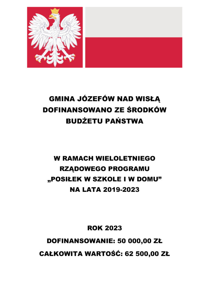 Gmina Józefów nad Wisłą w 2023r. otrzymała dofinansowanie na realizację zadania własnego w zakresie dożywiania dzieci i zapewnienia posiłku w ramach wieloletniego rządowego programu “Posiłek w szkole i w domu” na lata 2019-2023: Moduł 1 – Dla Dzieci i Młodzieży oraz Moduł 2 – Dla Osób Dorosłych, z przeznaczeniem na dofinansowanie wsparcia w formie posiłku, świadczenia pieniężnego na zakup posiłku lub żywności, świadczenia rzeczowego w postaci produktów żywnościowych.