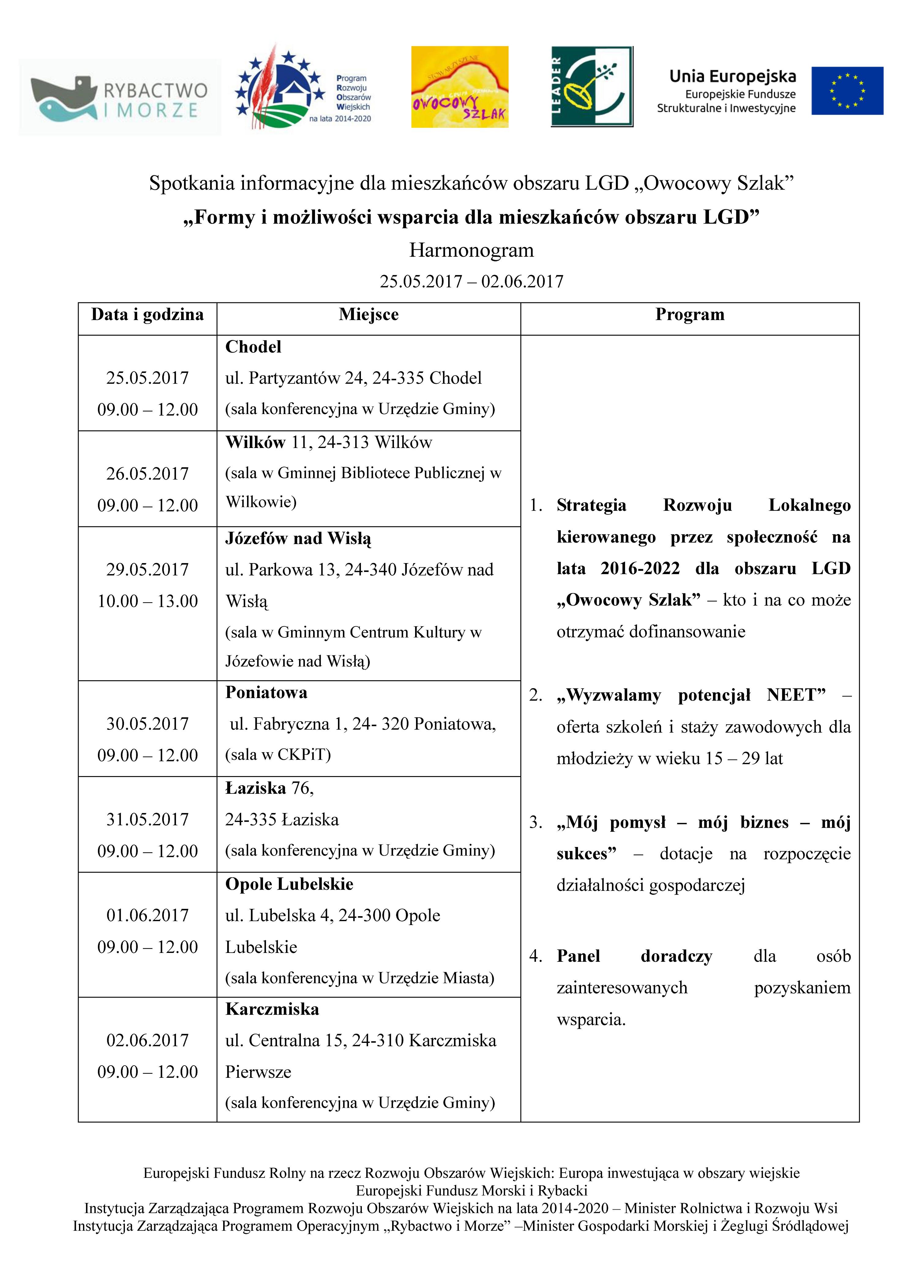Lokalna Grupa Działania „Owocowy Szlak” serdecznie zaprasza mieszkańców obszaru LGD na spotkania informacyjne dotyczące możliwości pozyskania różnego rodzaju wsparcia w tym między innymi finansowego, szkoleniowego, stażowego i doradczego. Pomoc oferujemy w ramach następujących działań: