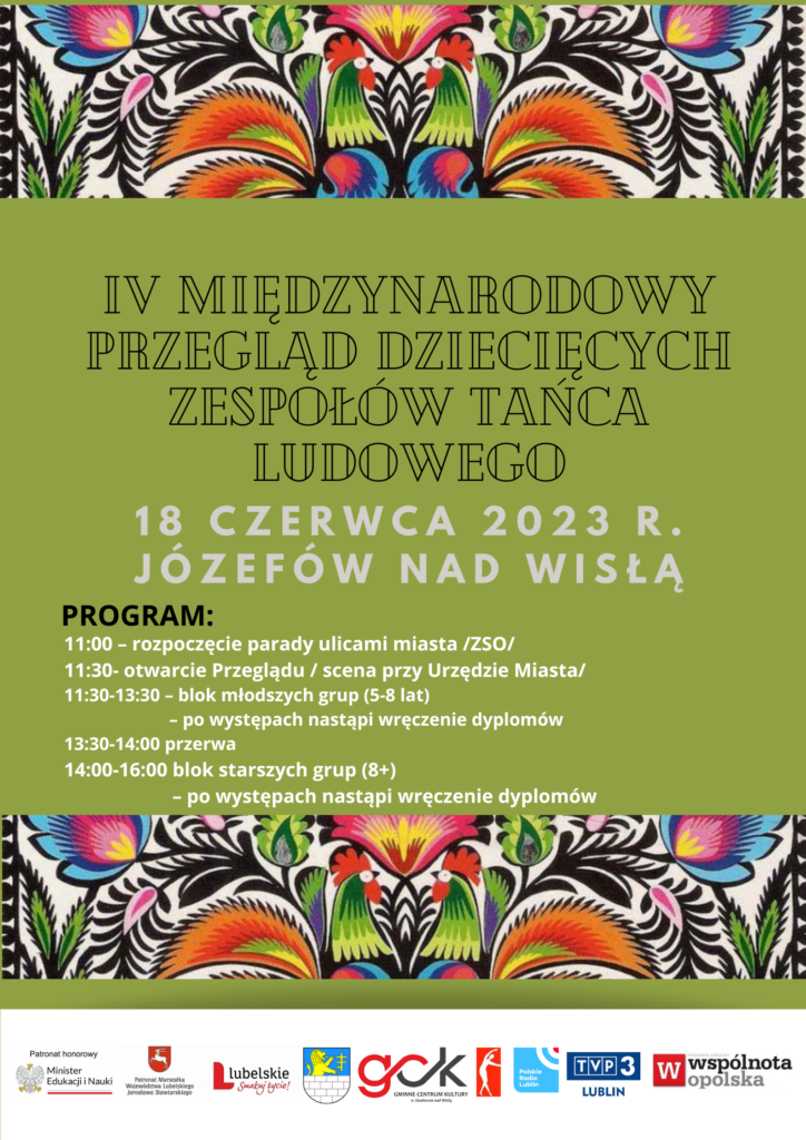IV Międzynarodowy Przegląd Dziecięcych Zespołów Tańca Ludowego w Józefowie nad Wisłą Więcej informacji: https://gckjozefow.pl/index.php/2023/06/06/iv-miedzynarodowy-przeglad-dzieciecych-zespolow-tanca-ludowego-w-jozefowie-nad-wisla/