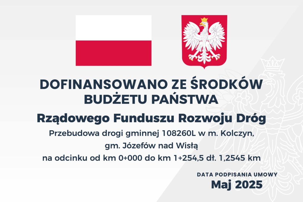 Dzisiaj, w Lubelskim Urzędzie Wojewódzkim, Burmistrz Józefowa nad Wisłą Paweł Grabek, podpisał z Wojewodą Lubelskim umowę na dofinansowanie zadania pod nazwą „Przebudowa drogi gminnej nr 108260L w miejscowości Kolczyn”. Środki pochodzą z Rządowego Funduszu Rozwoju Dróg.