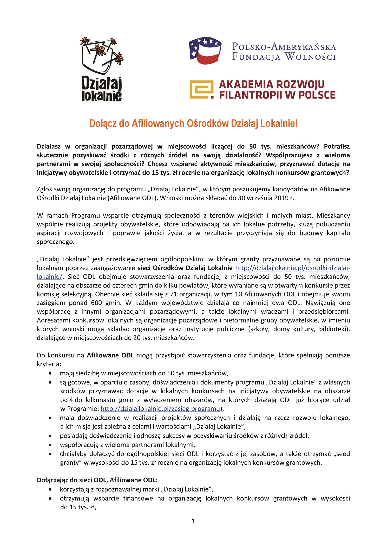 Nowy nabór na afiliowane Ośrodki Działaj Lokalnie Więcej informacji można znaleźć na naszej stronie internetowej: http://dzialajlokalnie.pl/dolacz-afiliowanych-osrodkow-dzialaj-lokalnie/ Regulamin naboru (kliknij)