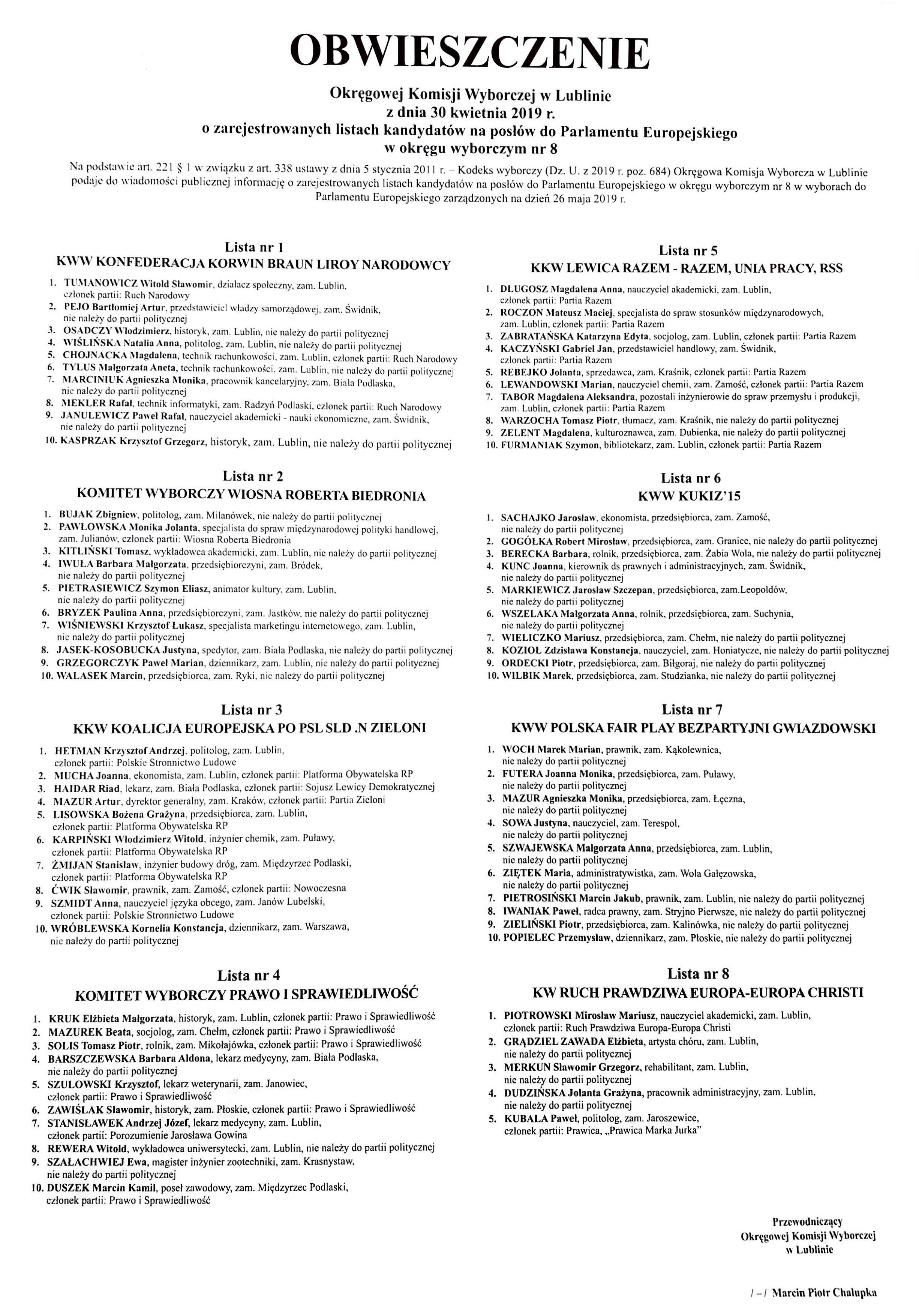 Obwieszczenie OKW w Lublinie o zarejestrowanych listach kandydatów do PE