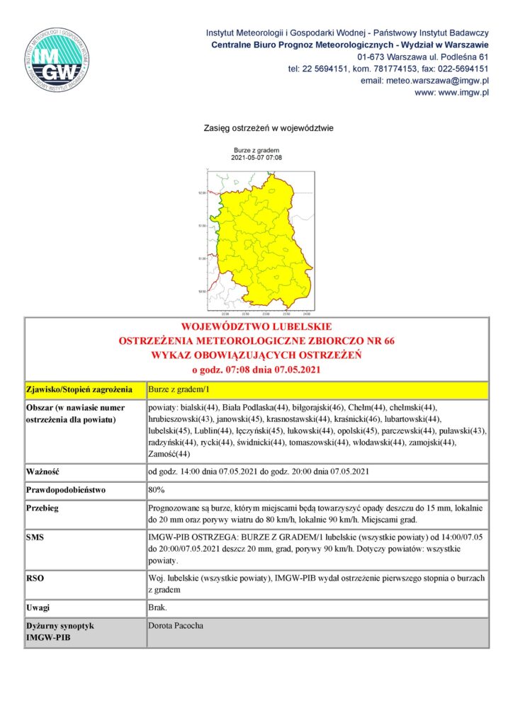 Ostrzeżenie o burzach z gradem z dn. 07.05.2021 r.
