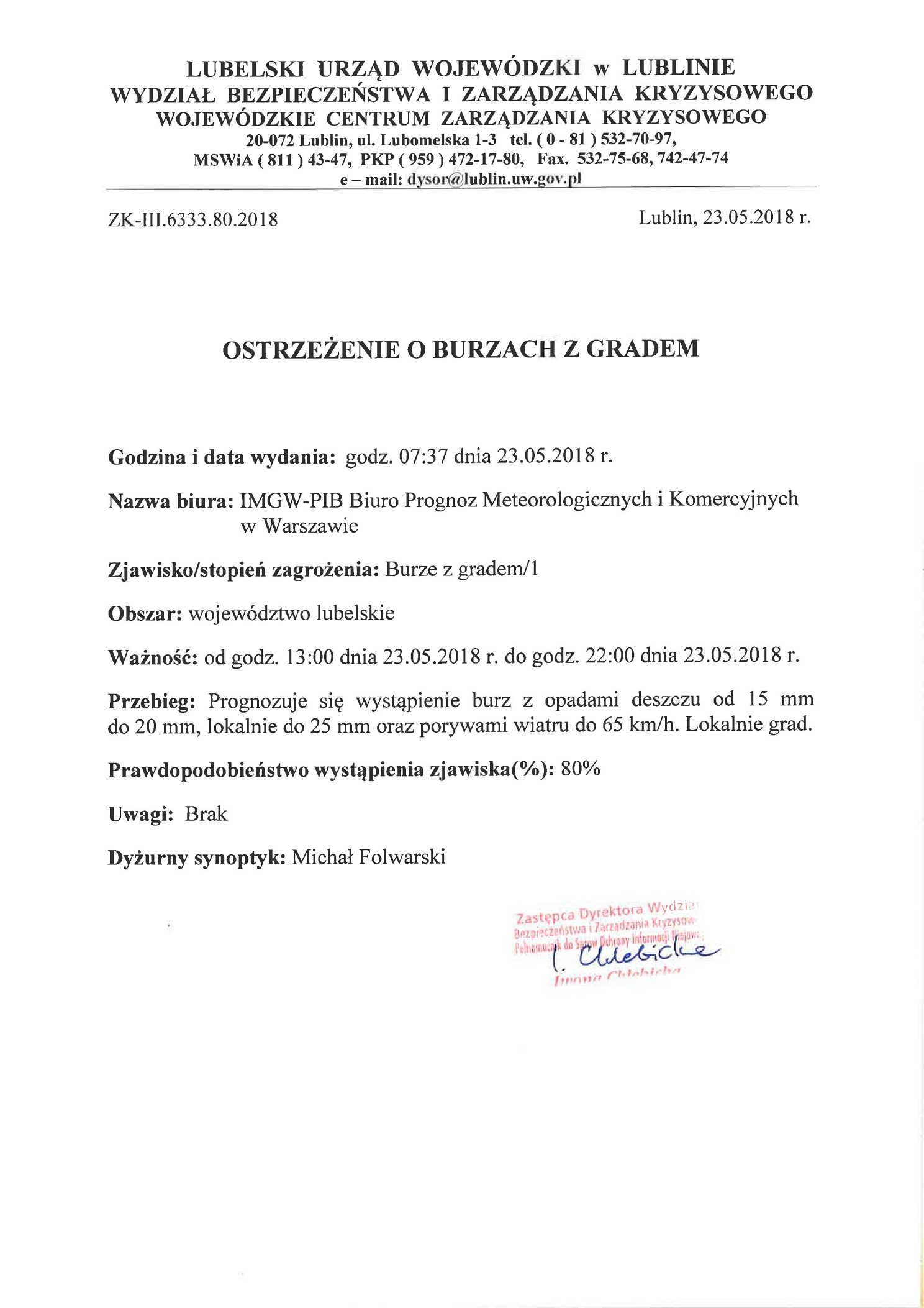 Ostrzeżenie o burzach z gradem z dn. 23.05.2018 r.