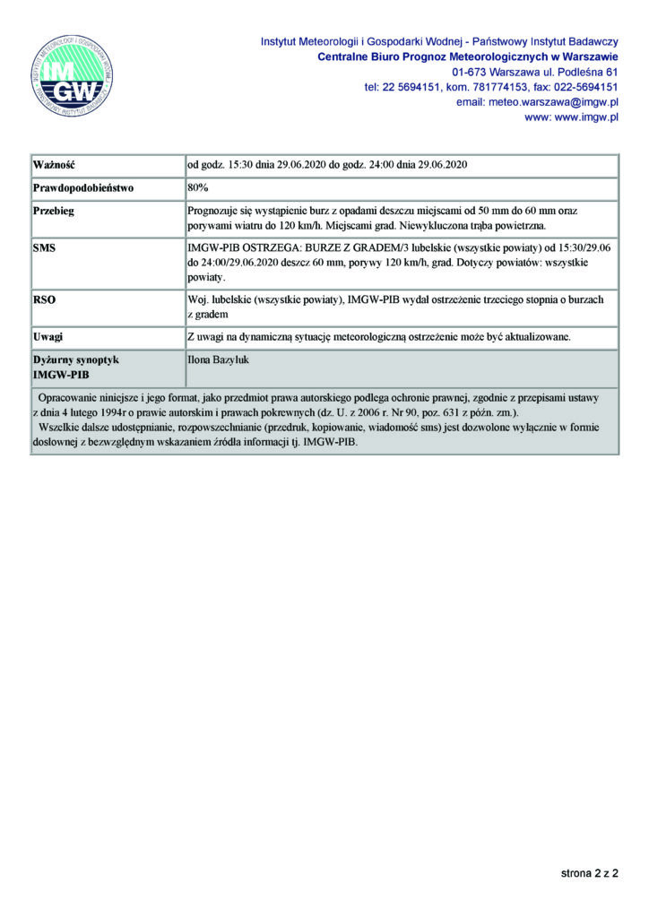 Ostrzeżenie o burzach z gradem z dn. 29.06.2020 r.