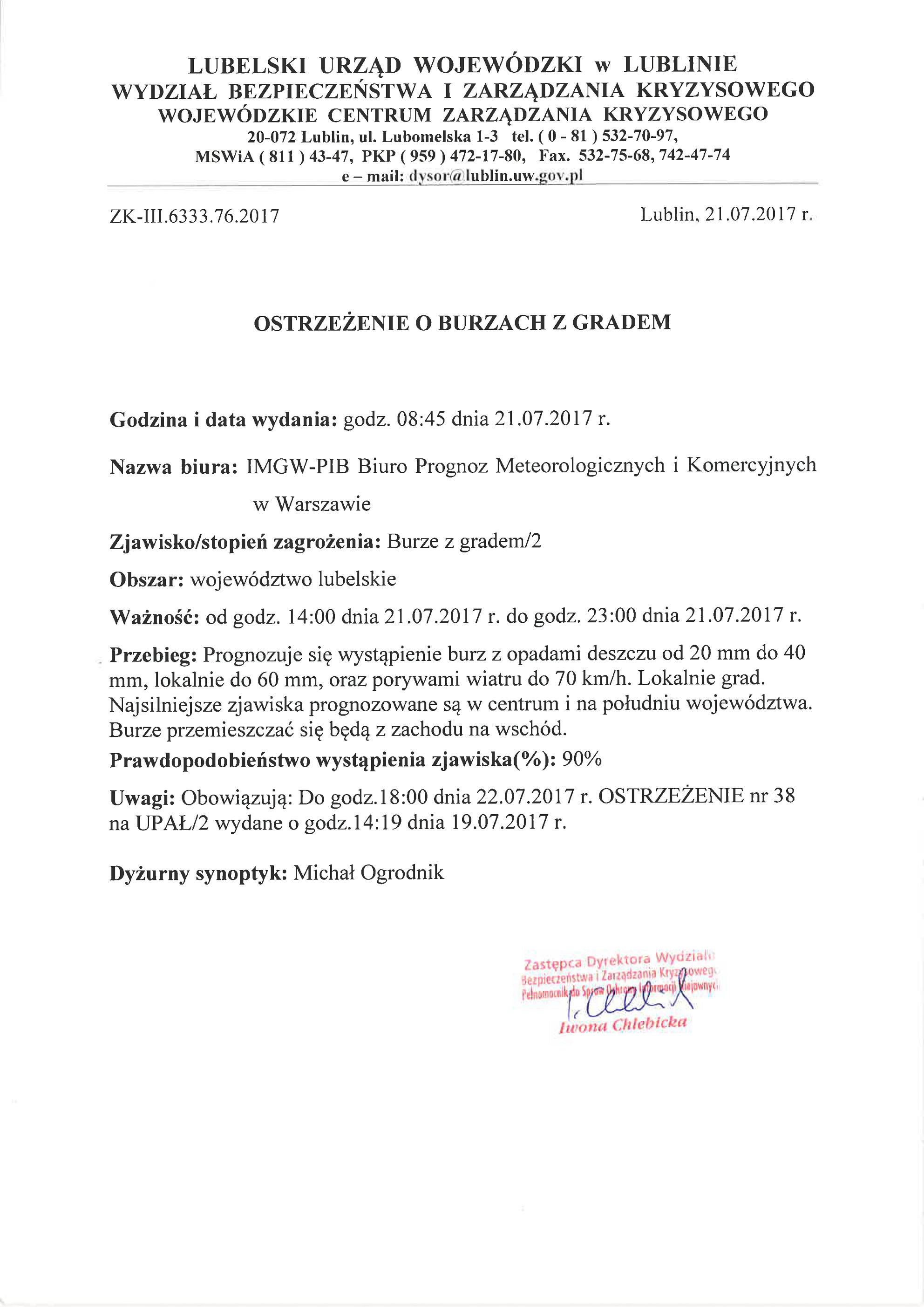 Ostrzeżenie o burzach z gradem z dnia 21.07.2017 r.