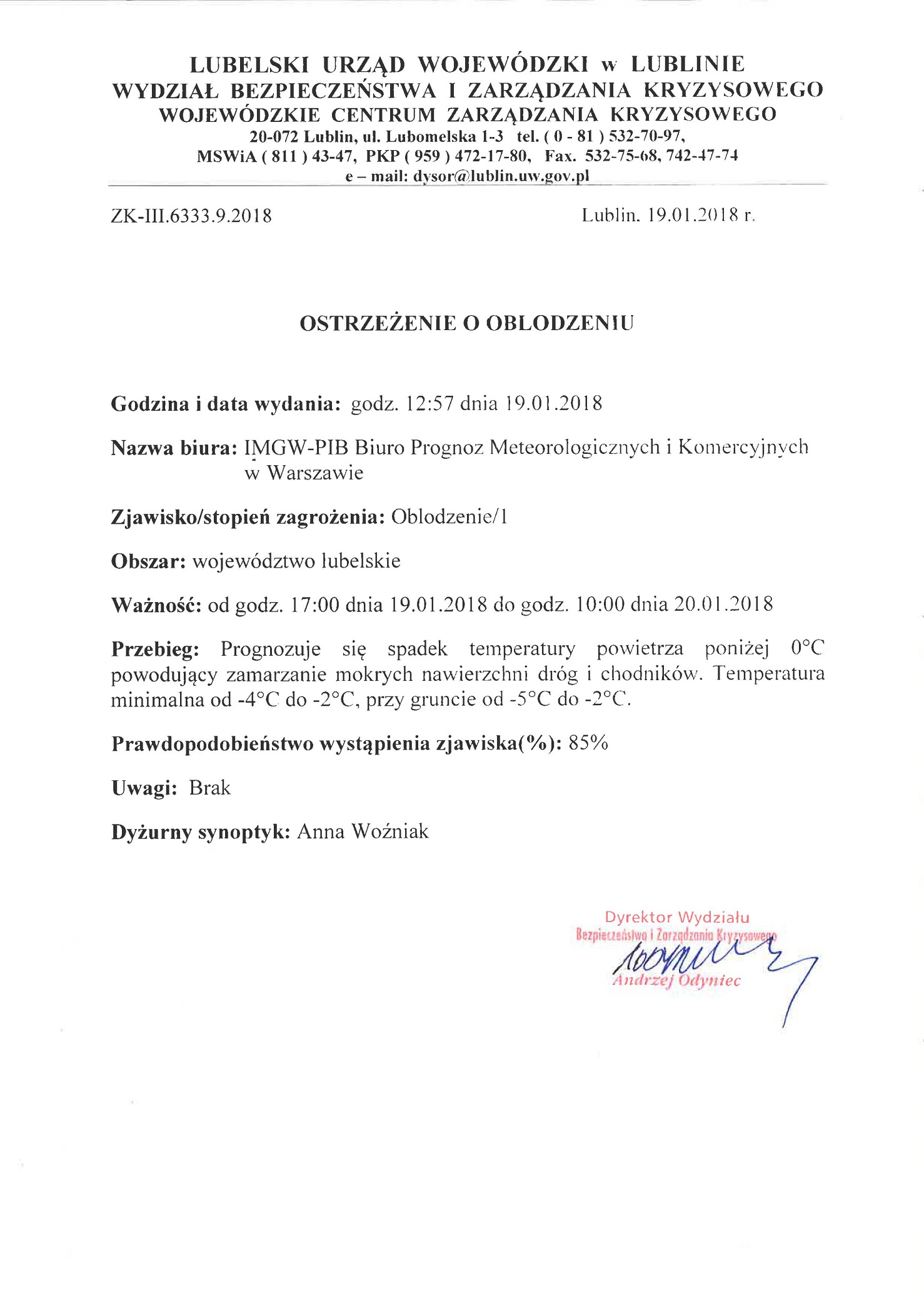 Ostrzeżenie o oblodzeniu z dnia 19.01.2018 r.