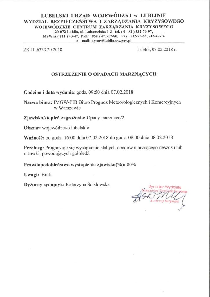 Ostrzeżenie o opadach marznących z dnia 07.02.2018 r.