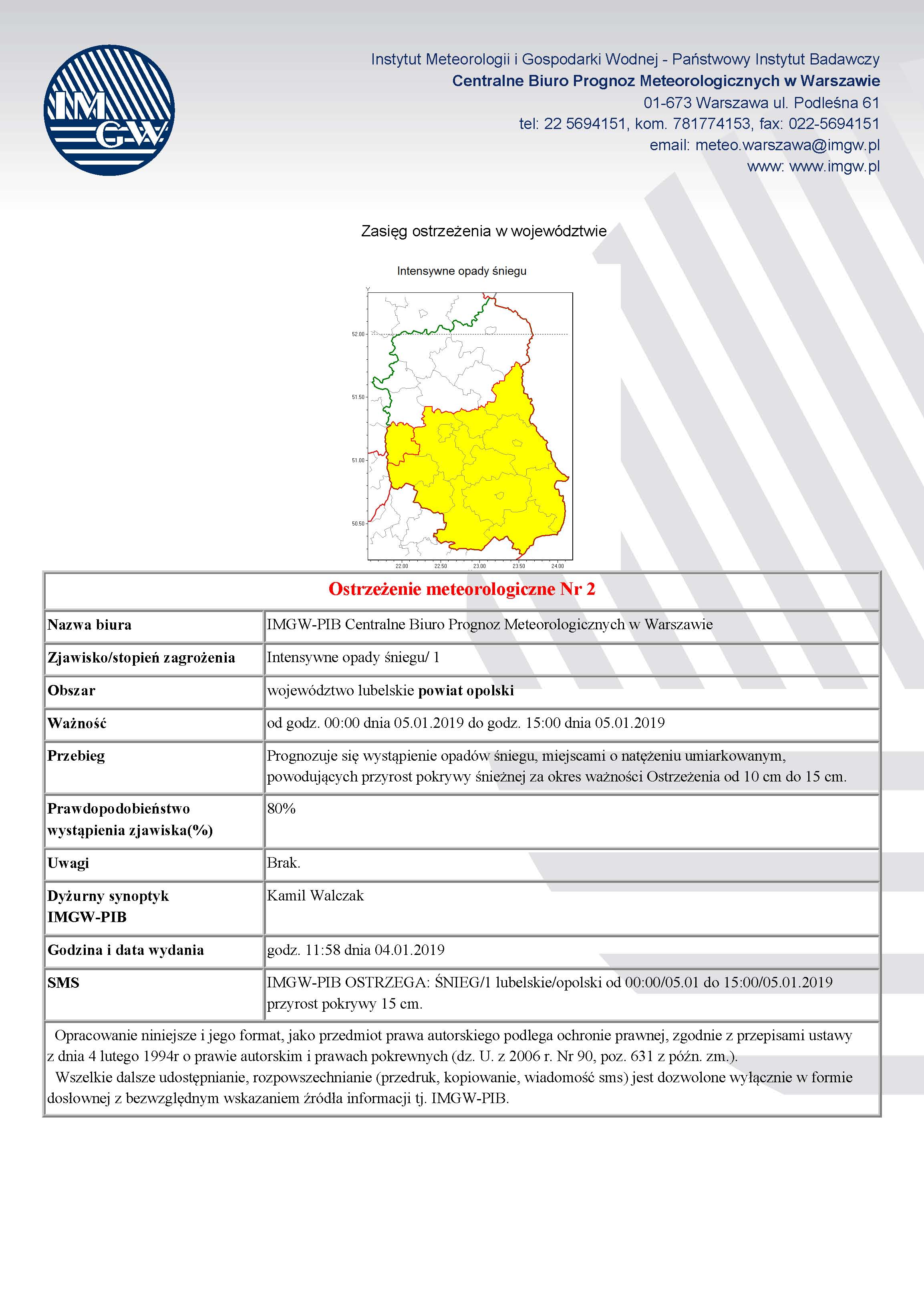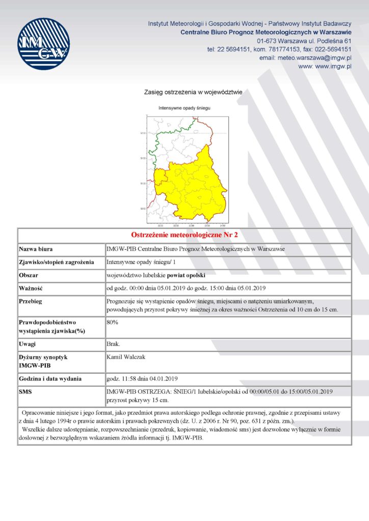 Ostrzeżenie o opadach śniegu z dn. 04.01.2019 r.