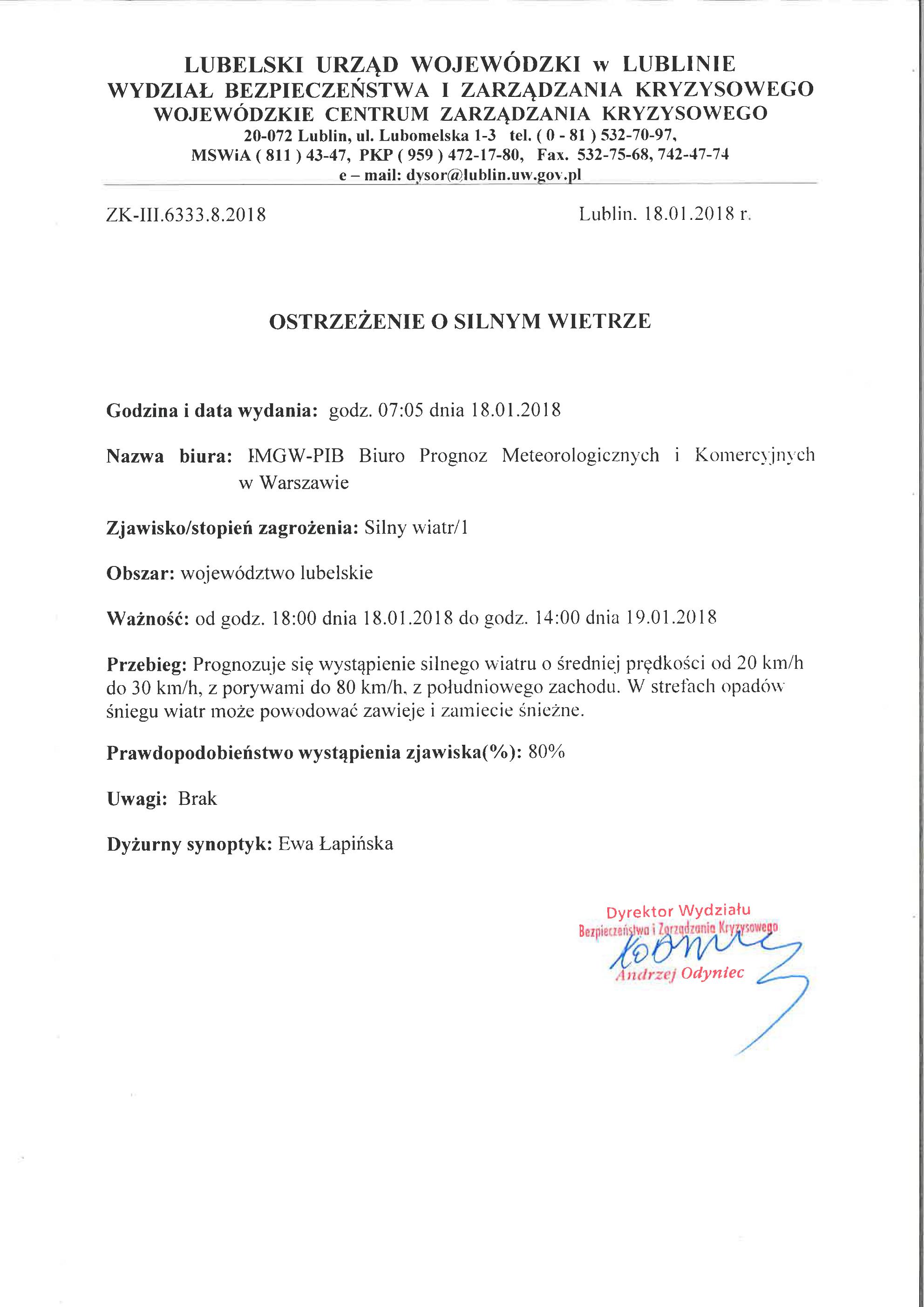 Ostrzeżenie o silnym wietrze z dnia 18.01.2018 r.
