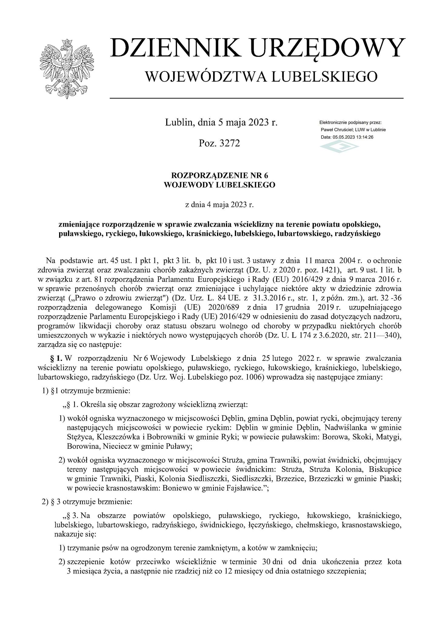 Informujemy, że w związku ze stwierdzeniem ogniska wścieklizny u lisa na terenie województwa lubelskiego w miejscowości Struża, gmina Trawniki, powiat świdnicki, Wojewoda Lubelski wydał rozporządzenie Nr 6 z dnia 4 maja 2023 r. zmieniające rozporządzenie w sprawie zwalczania wścieklizny na terenie powiatu opolskiego, puławskiego, ryckiego, łukowskiego, kraśnickiego, lubelskiego, lubartowskiego, radzyńskiego i wprowadza nakaz: