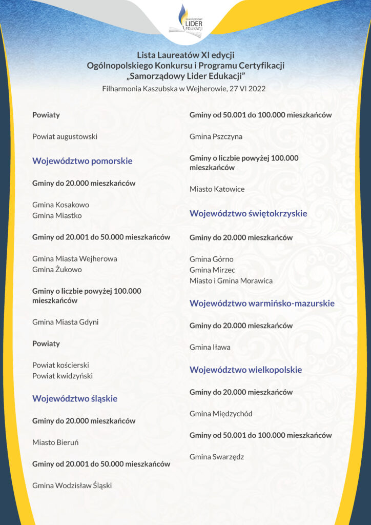 Już po raz jedenasty spotykaliśmy się na Gali Finałowej Konkursu „Samorządowy Lider Edukacji”, służącego wyróżnianiu JST, które najlepiej w Polsce realizują zadania z zakresu polityki oświatowej. Nagradzane przez Komisję Certyfikacyjną gminy, powiaty i samorządne województwa to jednostki, w których polityka oświatowa jest ze wszach miar nowoczesna, zorientowana na przyszłość, prowadzona według wysokich standardów jakościowych. Nasi Laureaci to samorządy, które warto promować, prezentować opinii publicznej, podawać za wzór do naśladowania dla innych jednostek terytorialnych – krajowych i zagranicznych. Gminy i Powiaty certyfikowane w Konkursie są wizytówkami polskiej samorządności.