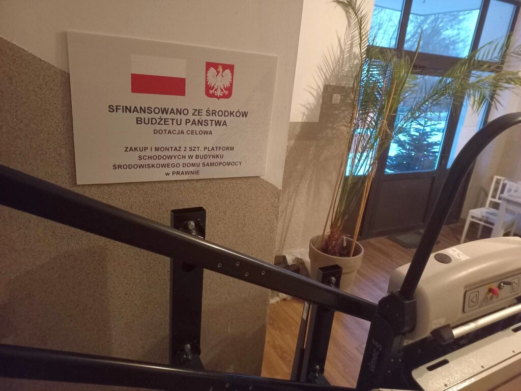 W grudniu bieżącego roku zrealizowano zadanie zakupu i montażu 2 sztuk platform schodowych w budynku Środowiskowego Domu Samopomocy w Prawnie. Zakupione urządzenia ułatwiają poruszanie się pensjonariuszy ŚDS w Prawnie. Zadanie sfinansowano ze środków dotacji celowej z budżetu państwa.