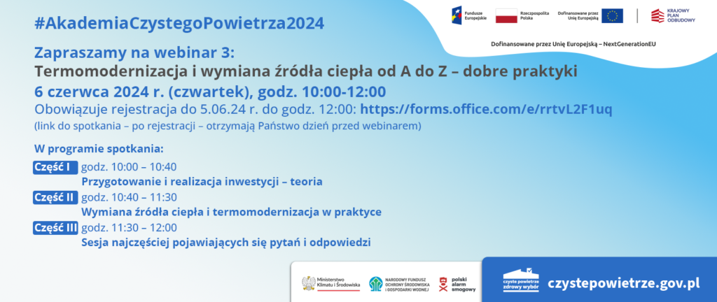 #AkademiaCzystegoPowietrza2024 – 6 czerwca o godz. 10:00. Zapraszamy na 3. webinar o termomodernizacji i wymianie źródła ciepła w programie „Czyste Powietrze”